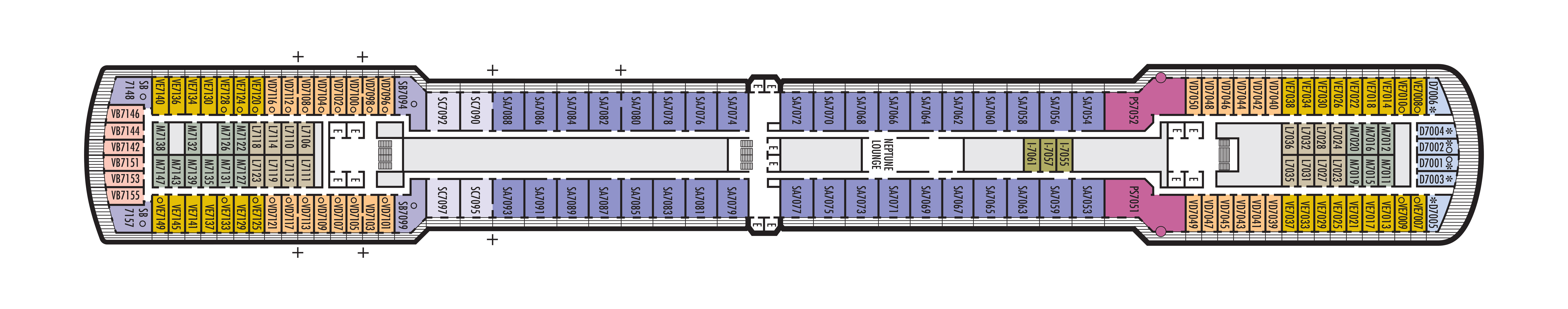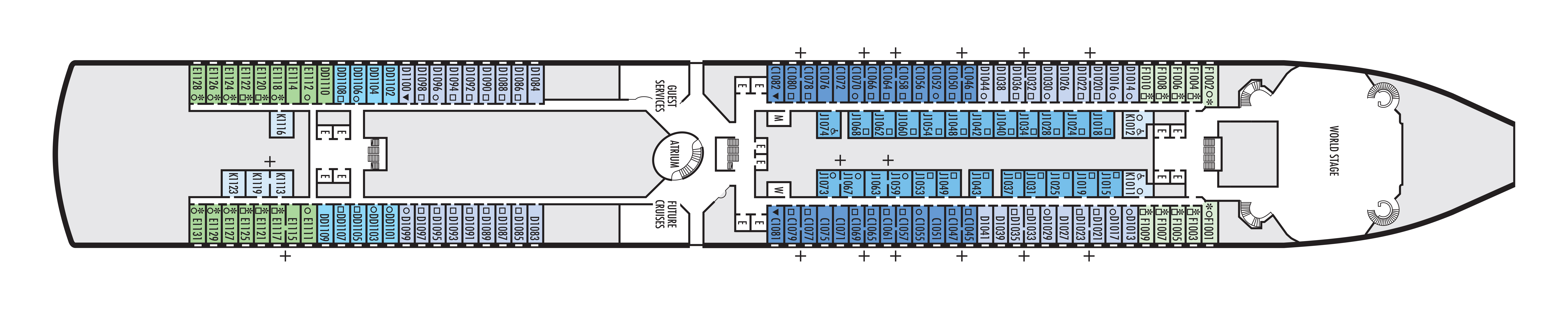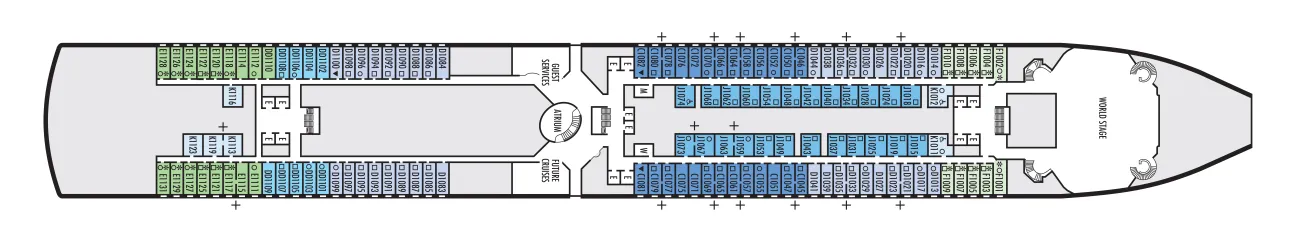 - Less ocean movement and proximity to Lower Promenade dining and entertainment.