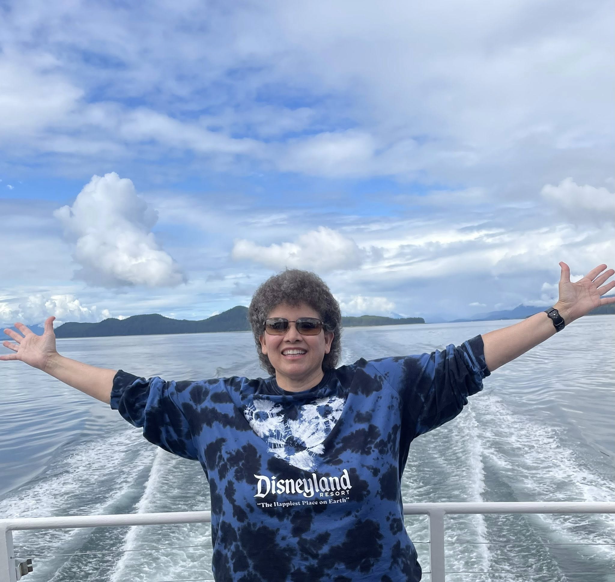 Smiling woman standing on the deck of a cruise ship with the ocean and mountains in the background
